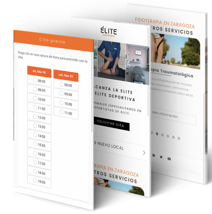 Desarrollo web con gestión de citas online para Elite fisioterapia, clínica de fisioterapia de Zaragoza donde encontrarás la mejor atención de profesionales especializados en fisioterapia avanzada y deportiva , para ofrecerte un tratamiento y seguimiento totalmente personalizado en unas instalaciones premium.